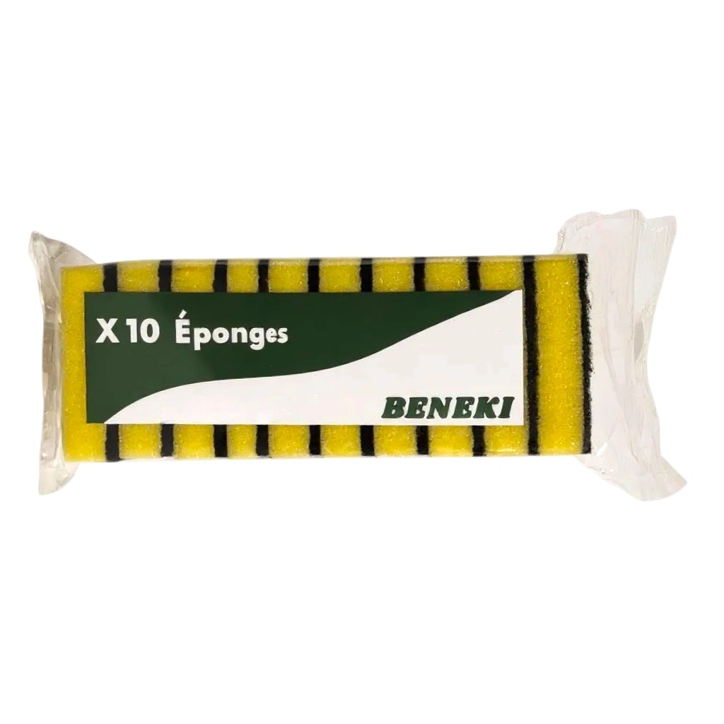 Éponge en mousse synthétique jaune avec côté abrasif. Sous emballage de 10 éponges.